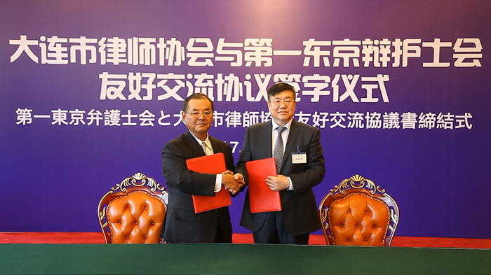 13日下午,双方在棒棰岛宾馆签订了友好交流协议。自2011年以来两会一直保持着互访活动,友好交流协议的签订是两会关系发展史上的一座里程碑,它标志着两会交流的正式开始,也必将开启两地律师友好往来的新篇章。市律师协会会长杨家君、第一东京辩护士会副会长尾崎行正分别致辞。